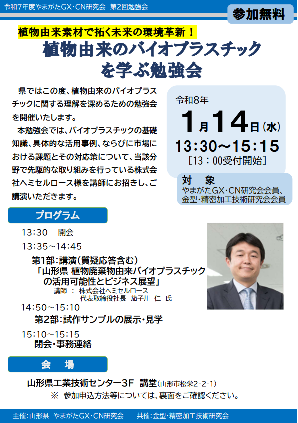 当社は、2026年1月14日(水)に開催される、やまがたGX・CN研究会「植物由来のバイオプラスチックを学ぶ勉強会」に代表の茄子川が登壇します。