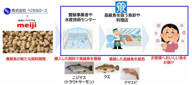 新たな連携プロジェクトとして「脱脂粉乳とヘミセルロースを活用した養殖魚の新たな飼料開発」が採択されました。今後、株式会社明治(代表取締役社長:八尾 文二郎)とともに事業化に向けたの実証を行います。